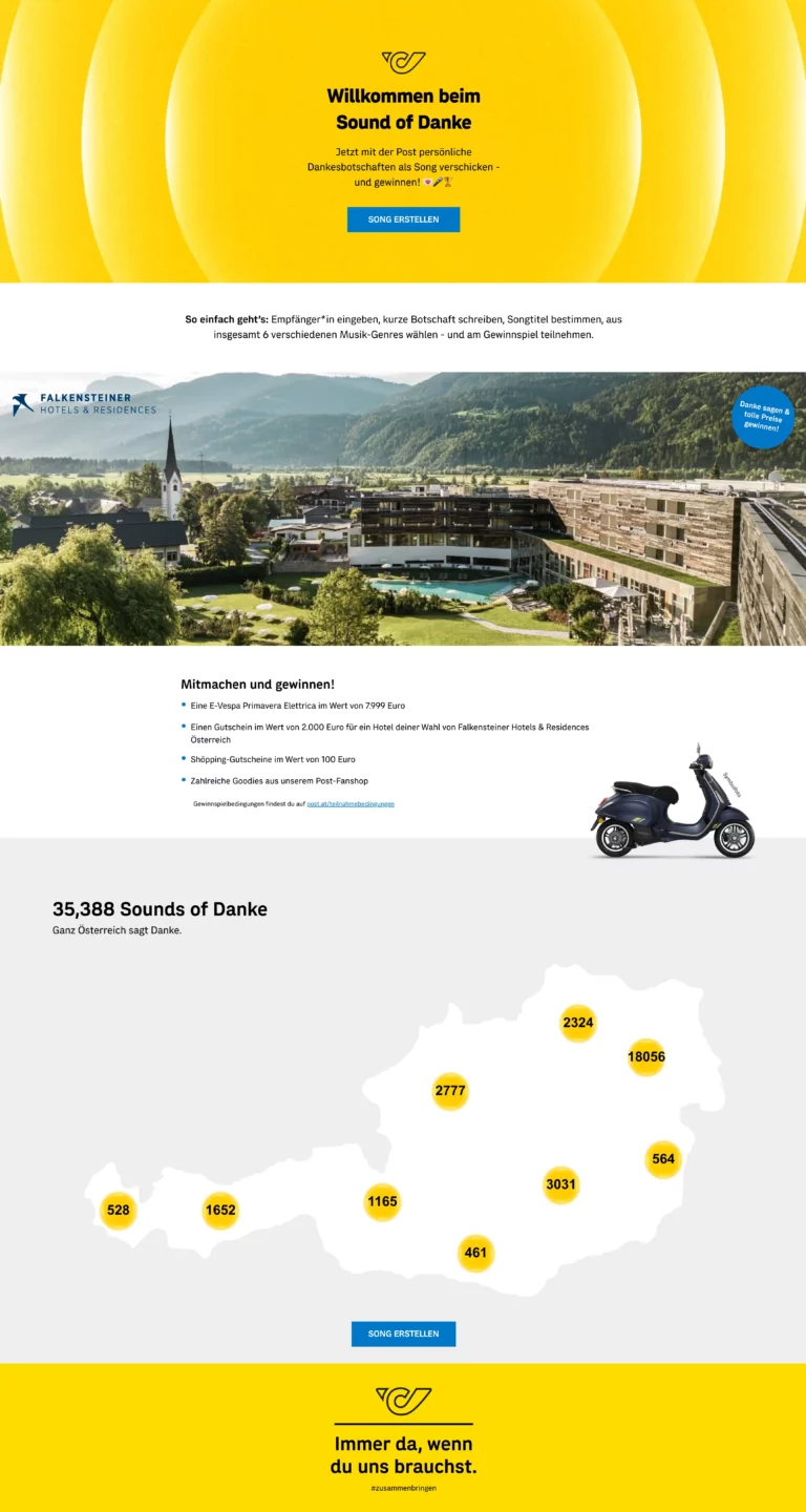 Umgesetzt haben wir die Experience als KI-gestützte Song-Plattform, auf der persönliche Botschaften in konsumier- und teilbare Songs verwandelt wurden. Zentraler Einstiegspunkt war die Landingpage soundofdanke.at, welche die gesamte Journey bündelte und auf Tempo, Klarheit und sofortige Belohnung optimiert war. In der Kommunikation setzte die Kampagne auf einen konsequenten Dialog-first-Ansatz: Der Schwerpunkt lag auf Direct Mailing und E-Mail, verstärkt durch Social und Display. Als zusätzlicher Participation- und Consent-Treiber wurde ein Gewinnspiel integriert – als zusätzlicher Mitmach-Anreiz nach dem eigentlichen Kernmoment, dem Song.