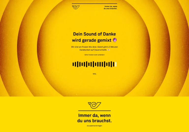 Die Leitidee war ebenso einfach wie stark: „Sound of Danke“ – personalisierte Musikgrüße aus einer kurzen Nachricht. Aus einer individuellen Botschaft, der Auswahl eines Musikgenres und der Angabe der adressierten Person entstand in Sekunden ein eigener Danke-Song: ein moderner, emotionaler Gruß, der sich anhören und teilen lässt. „Danke“ wurde wortwörtlich hörbar – und die Post übernahm dabei die Rolle der Ermöglicherin: Sie ließ Menschen miteinander sprechen, statt nur über Kommunikation zu reden.